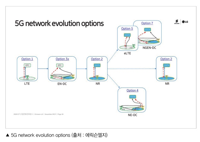 이어 “5G 네트워크로의 진화는 5G 네트워크와 LTE의 연동이나 5G 코어 망의 적용 여부에 따라 다양한 연결 옵션이 가능하며, 사업자의 주파수 보유 현황과 서비스 계획, 5G 코어망 도입 시점 등에 따라 달라질 수 있다.”고 지적 했다.