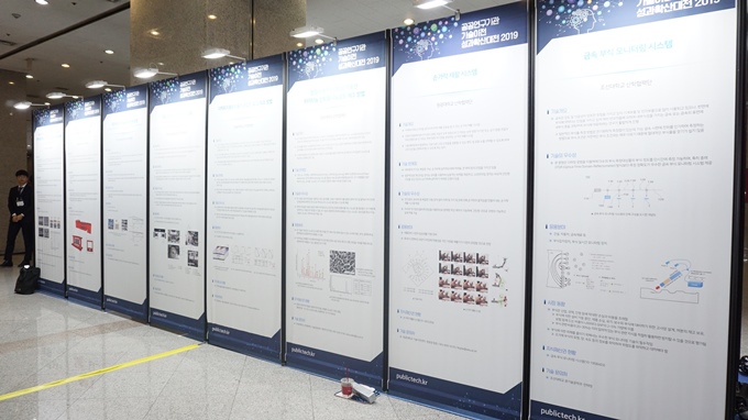 ▲ '공공연구기관 기술이전 성과확산대전 2019'에서는 CAE 모델차수축소기법 및 머신러닝을 이용한 구조물의 결함 진단 기술(안동대), 양산 차량용 하이브리드 시스템(한기대), 초고강도 열연 강판용 열간나이프 소재(국민대), 사물 인터넷 기반의 자동차 소모부품 수명 예지 시스템(대구대), 금속 부식 모니터링 시스템(조선대) 등 우수 공공기술 판넬 20개가 전시됐다.