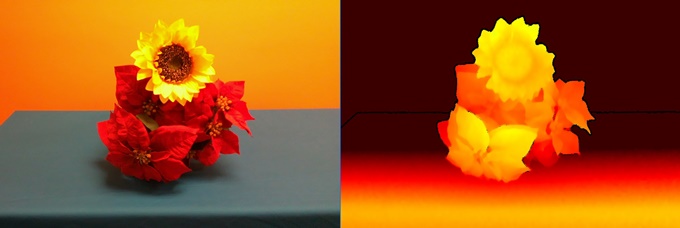 ▲인텔 리얼센스 라이다 카메라 L515로 촬영한 심도 이미지(우) RGB 이미지(좌)