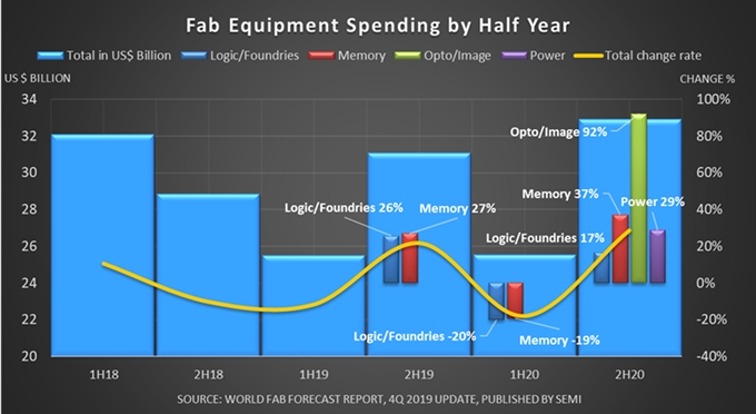 소니가 주도하는 이미지 센서 분야의 팹 장비 투자액은 2020년 상반기에 20 %, 하반기에는 90 % 이상 증가하여 16 억 달러에 이를 것으로 예상된다. 인피니언, ST 마이크로일렉트로닉스, 보쉬가 주도하는 전력 반도체에 대한 투자는 2020 년 상반기 40 % 이상, 하반기 29 % 증가하여 약 17 억 달러에 이를 것으로 보인다.