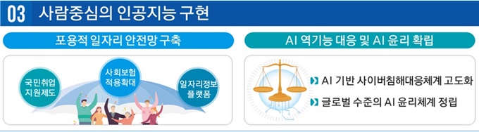 3대 분야는 세계를 선도하는 AI 생태계 구축, AI를 가장 잘 활용하는 나라, 사람중심의 AI 구현이다. 구체적인 내용을 살펴보면 다음과 같다.