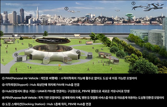 UAM, PBV, Hub는 긴밀한 상호작용을 통해 인류의 삶을 보다 가치 있게 만들고, 인간 중심의 역동적(Vitalize)인 미래도시를 구현하는 핵심으로 작용한다. 또한 하늘과 지상을 연결하고 PBV는 도로 위에서 사람과 사람을 연결하며, 두 종류의 스마트 모빌리티는 미래도시 전역에 설치될 Hub와 연결돼 모빌리티 생태계를 형성한다.