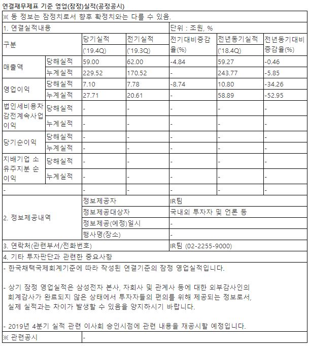삼성전자가 연결기준으로 매출 59조원, 영업이익 7.1조원의 2019년 4분기 잠정 실적을 발표했다.