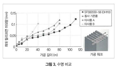 하드 1 볼(ø3 : SFSB2030-S6), 동사 기존품 및 타사(A사, B사)제 고경도재 가공용 볼 엔드밀을 이용해 SKD11(60HRC) 물결형 워크를 가공했을 때의 가공 수명 비교 결과를 그림 3에 나타냈다. 절삭 조건은 회전 속도 18,000min-1로 고속 회전, 이송 속도 1,500mm/min, 이송량 f=0.083mm/rev, 절입량 ap=0.15mm/min, ae=0.3mm이다.