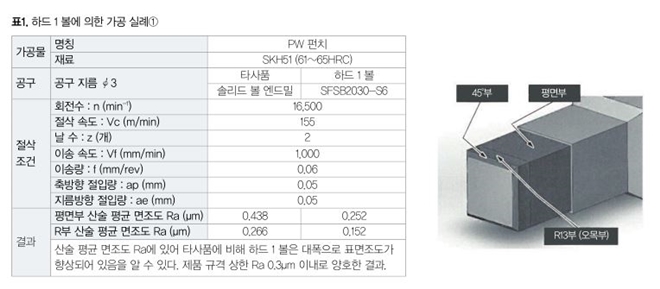 가공 제품 PW 펀치의 평면부 및 R부의 가공에서 하드 1 볼(ø3 : SFSB2030-S6)을 사용, 표면조도 향상을 도모한 실례를 소개한다(표 1). 피삭재는 SKH51(61~65HRC)의 고경도재이다.
