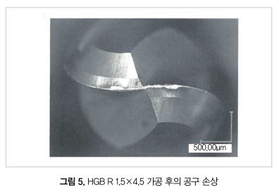 순수 재료에서 등고선 거친가공으로 1시간 41분 가공한 후의 HGB R 1.5의 공구 손상 상태를 그림 5에 나타냈다. 절삭 조건은 회전 속도 : 8,280min-1, 이송 속도 : 1,140mm/min, 절입량 : ap 0.12mm, ae 0.55mm, 쿨런트는 에어블로이다.