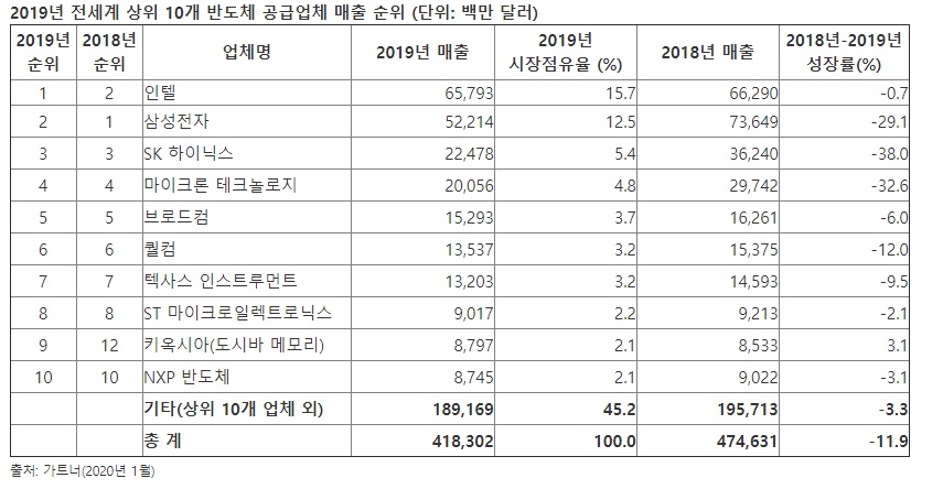 인텔은 2019년 매출에서 지난 2년간 삼성전자에 빼앗겼던 글로벌 반도체 공급업체 1위라는 위상을 되찾았다. 2019년 인텔의 반도체 매출은 서버 시장이 침체되고, 지속적으로 CPU 공급이 제한되며, 4 분기에 셀룰러 모뎀 사업을 애플에 판매하면서 0.7% 감소했다. 삼성전자는 다른 메모리 공급업체들과 마찬가지로, D램 및 NAND플래시 시장에서 과잉 공급 및 가격 하락으로 어려움을 겪었다. 매출의 82%를 차지했던 삼성전자의 메모리 매출은 2019년 34% 감소했다.