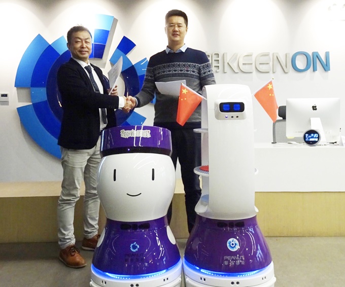 ▲ 일본 시스템 프로젝트와 중국의 상업 서비스 로봇 업체인 Keenon Robotics가 파트너십 계약을 체결하고 기념촬영을 하고 있다.