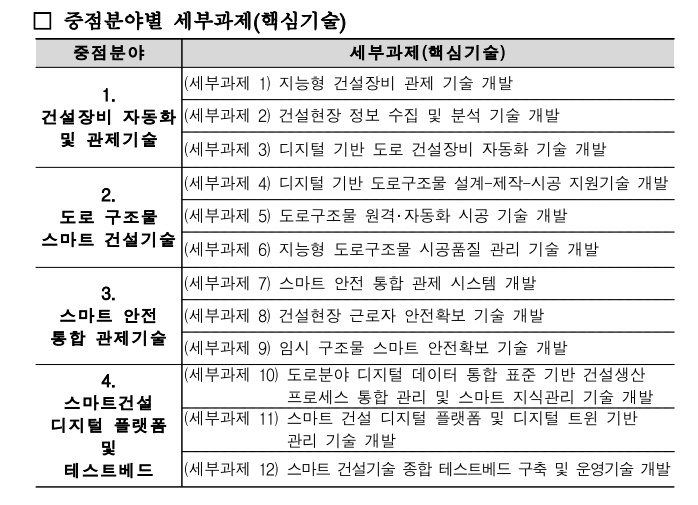 '스마트 건설기술 개발사업'은 총 4개의 중점분야(12개 세부과제)*로 구성되어 올해부터 6년간 약 2,000억 원(총 1,969억 원, 국비 1,476억 원, 민간 493억 원)의 사업비가 투입될 대형 연구개발(R&D) 프로젝트로서, 토공 장비 자동화와 다수 장비 간 협업 시공을 위한 실시간 통합관제*, BIM 기반 모듈러 시공**, 로봇을 활용한 무인 원격 시공***, 스마트 안전관리 및 디지털 트윈(실제 구조물을 그대로 재현하는 쌍둥이 모델)기반 가상시공 시뮬레이션 등 건설공정 전반을 획기적으로 혁신할 수 있는 주요 핵심기술들이 연구과제로 포함되어 있다.
