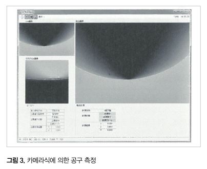 기존 공구 측정에는 레이저 측정기를 사용해 왔는데, 이번 측정장치를 레이저식에서 카메라식으로 진화시켰다. 공구 날끝에 이물이 부착해도 화상 인식에 의해 부착의 자동 판별을 가능하게 함으로써 고정도의 측정을 실현했다(그림 3).