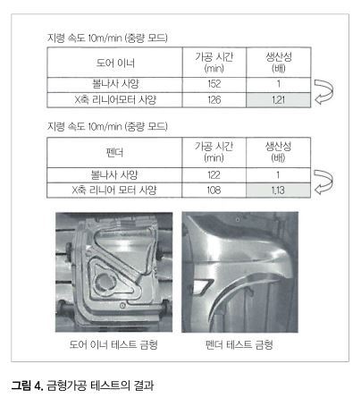 도어 이너의 가공은 연속의 가감속이 필요한 형상으로 하고, X축 리니어모터 채용에 의해 기존 볼나사 사양 대비 21%의 시간 단축 결과를 얻을 수 있었다(그림 4).