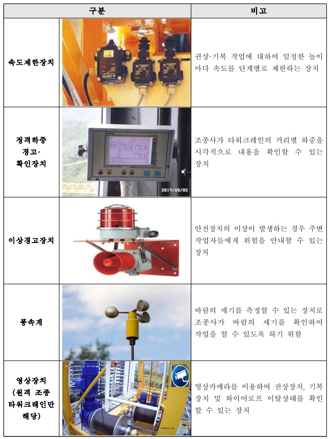 과도한 인양 및 무리한 작업을 예방하기 위해 타워크레인에 속도제한장치 및 정격하중 경고·확인장치, 풍속계, 이상경고장치를 의무적으로 설치하도록 하였으며, 원격조종방식의 타워크레인에는 와이어로프 이탈여부 등 이상여부를 확인할 수 있는 영상장치를 설치하도록 하였다.