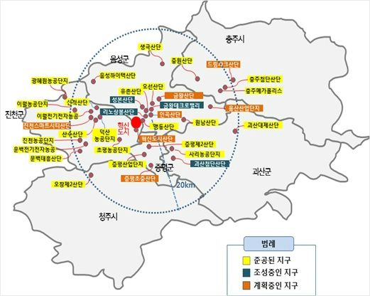도는 단지 지원 기반시설 조성을 위해 진천군 기전리에 ‘에너지융복합파크’, 음성군 맹동면 인곡산업단지에 ‘RE100 스마트산업단지’, 충북혁신도시 내 ‘반도체융복합산업타운’ 등을 주요 거점으로 구축한다는 계획이다.