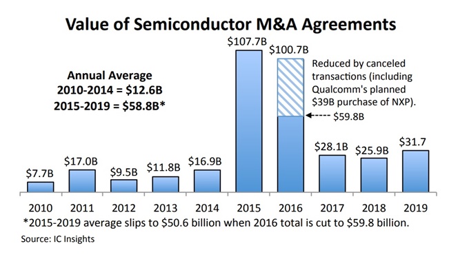 시장조사기관 IC인사이츠에 따르면 2019년에 30개가 넘는 반도체 인수 계약의 총 합산 가치는 318억 달러이며, 이는 2018년 259억 달러와 비교해 22% 증가했다고 분석했다. 2015년에는 사상 최대 금액인 1077억 달러를 기록했고, 2016년에는 1007억 달러를 기록했다. 즉, 2015년 이후로 연평균 25~30억 달러가 상승한 것이다. 2015년에서 2019년 사이의 반도체 인수합병 계약의 평균 연간 가치는 이전 5년 기간 (2010-2014)의 평균보다 4배 이상을 기록했다.