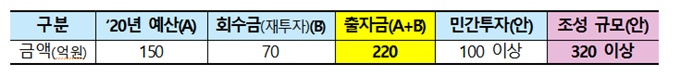 조성규모는 실감콘텐츠 시장이 초기 단계임을 감안해 신속한 펀드 결성을 통한 벤처‧중소기업 집중 투자를 위해 총 320억 원을 결성 목표로 정부가 220억 원을 출자하고, 100억 원 이상 민간 출자를 유도한다.