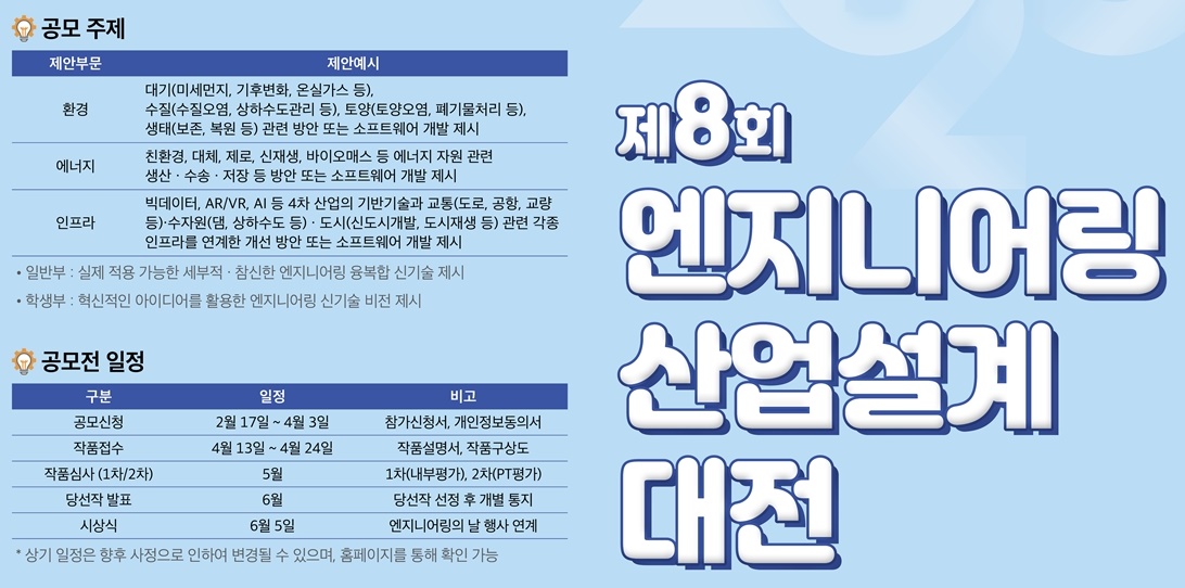 올해로 8회째를 맞이한 이번 행사의 공모 주제는 ‘제안부문(환경·에너지·인프라)에 엔지니어링 신기술을 적용하여 참신한 설계 아이디어 제시’이다.