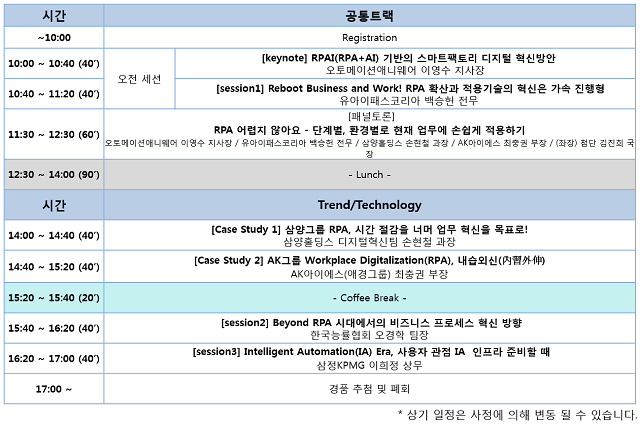 전시회 행사기간인 3월 5일에 열리는 이 컨퍼런스에는 대표적인 RPA 기업 ▲오토메이션애니웨어와 ▲유아이패스가 참가한다. 또, RPA 도입 기업으로 ▲삼양홀딩스와 ▲AK아이에스(애경그룹)가 참가해 직접 체감한 성과와 효율성 등을 소개할 예정이다. RPA 시대 비즈니스 프로세스 구축과 관련해서는 ▲한국능률협회 ▲삼정KPMG 측이 자세한 내용을 설명할 방침이다.