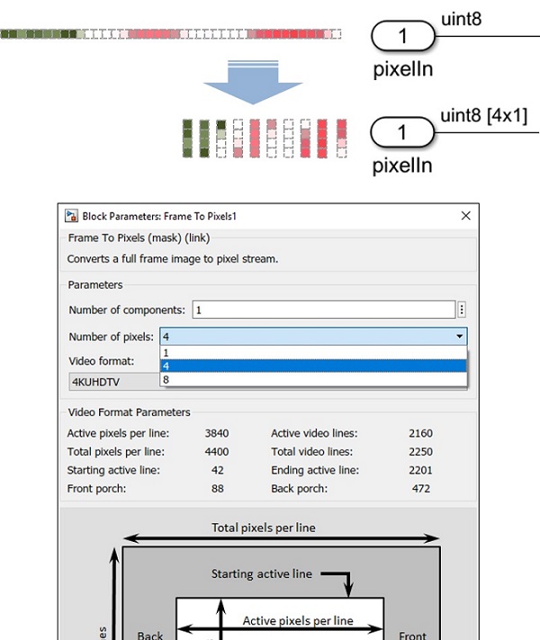 비전 HDL 툴박스는 4 또는 8픽셀을 병렬 방식으로 처리하는 블록을 제공하며, 지정된 병렬 처리로 시뮬레이션 및 코드 생성을 수행하도록 기반 하드웨어 구현을 자동적으로 업데이트한다. 이러한 기능은 하드웨어 엔지니어가 이미지 및 영상 처리 엔지니어와 협업을 통해 높은 추상화 수준에서 비전 처리 하드웨어 동작을 탐색 및 시뮬레이션할 수 있도록 지원한다.