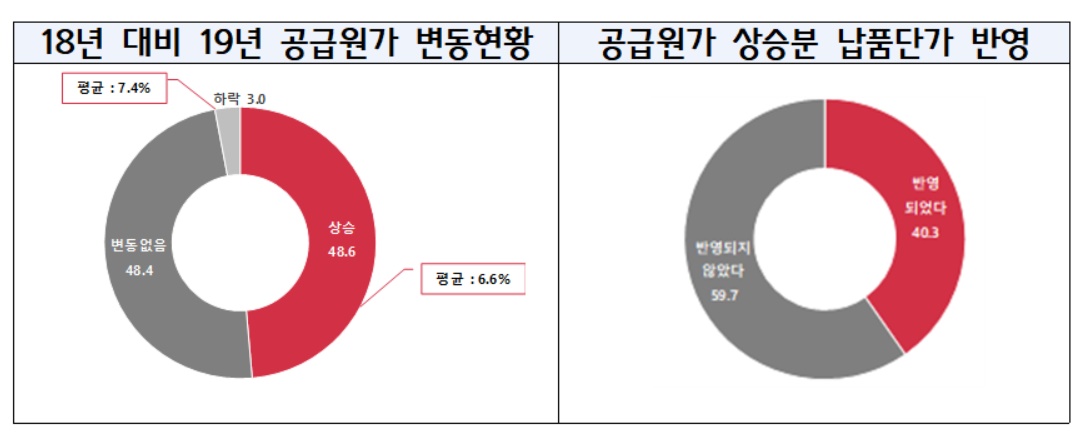 이 조사 결과에 따르면, 2018년 대비 2019년 재료비, 노무비 등 평균 공급원가 상승률은 6.6%인 것으로 조사되었다. 공급원가가 상승했다고 응답한 업체는 48.6%로 나타났으며, 공급원가가 상승했다고 응답한 업체 10개 중 6개 기업(59.7%)은 공급원가 상승분을 납품단가에 반영하지 못한 것으로 나타났다.