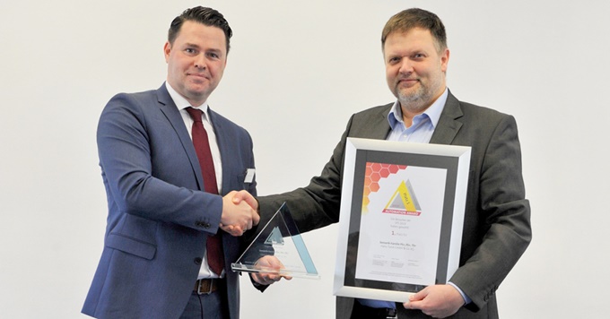 ▲ elektro Automation 의 편집장 Michael Corban이 터크의 프로덕트 매니저인 Raphael Scholzen에게 수상하고 있다.