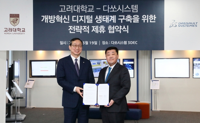 다쏘시스템과 고려대 공과대학은 19일 서울 강남구 삼성동 다쏘시스템코리아 3D 체험센터인 3D익스피리언스 이그제큐티브 센터에서 디지털 생태계 구축을 통한 미래형 공학교육 혁신 및 산업체 응용기술의 발전을 위한 양해각서를 체결했다.