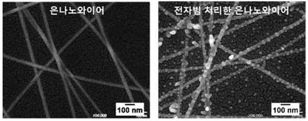 ▲기존 은나노와이어소재(왼쪽)와 전자빔 처리한 은나노와이어 소재(오른쪽)의 비교 사진