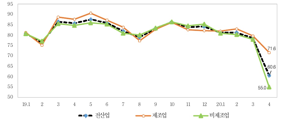 비제조업에서는 건설업(88.7→72.0)이 16.7p 하락하였으며, 서비스업(75.7→51.5)은 전월대비 24.2p 하락하였다.