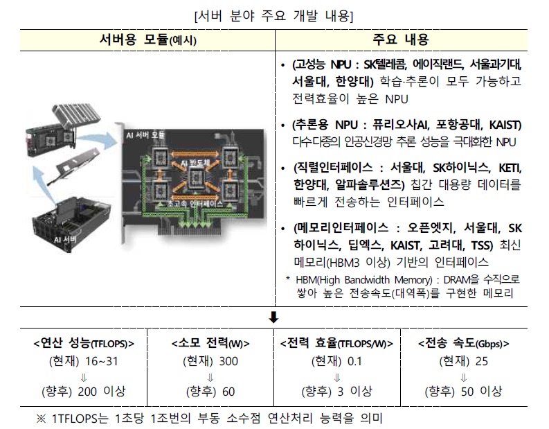 서버 분야에서는 SK텔레콤, 퓨리오사AI, 오픈엣지, 서울대, SK하이닉스 등 15개 기관이 참여한 컨소시엄이 최대 8년간 총 708억원을 투입하여 클라우드 데이터센터 등 고성능 서버에 활용 가능한 AI 반도체(NPU)와 인터페이스를 개발한다.