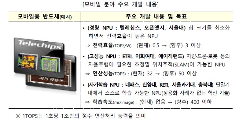모바일 분야에서는 텔레칩스, 한국전자통신연구원(ETRI), 네패스, 이화여대, 한양대 등 11개 기관이 참여한 컨소시엄이 5년간 총 460억원을 투입하여 자율주행차·드론 등 모바일 기기에 활용 가능한 다양한 AI 반도체(NPU)를 개발한다.