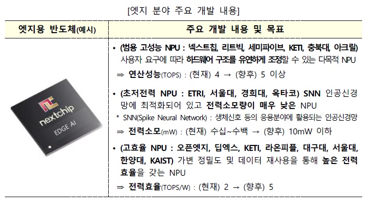 엣지 분야에서는 넥스트칩, 한국전자통신연구원(ETRI), 오픈엣지, 딥엑스, 세미파이브, KETI 등 17개 기관이 참여한 컨소시엄이 5년간 총 419억원을 투입하여 영상보안·음향기기·생체인증보안기기 등 사물인터넷(IoT) 디바이스에 활용 가능한 다양한 AI 반도체(NPU)를 개발한다.