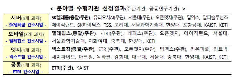 대기업(SK텔레콤․SK하이닉스), 중소기업(텔레칩스․넥스트칩 등), 스타트업(퓨리오사AI․딥엑스․오픈엣지 등) 등 관련기업 대부분(16개)을 비롯하여 10개 대학과 2개 출연연이 참여할 예정이며, 특히, 국내 AI 서비스 기업을 대표하는 SK텔레콤과 팹리스(설계전문기업)를 대표하는 텔레칩스, 넥스트칩이 서버·모바일·엣지 분야의 컨소시엄 총괄기관으로 참여하여 분야별 개발 결과물을 통합한 칩(System on Chip) 제작 및 실증 등의 핵심적인 역할을 수행할 예정이다.