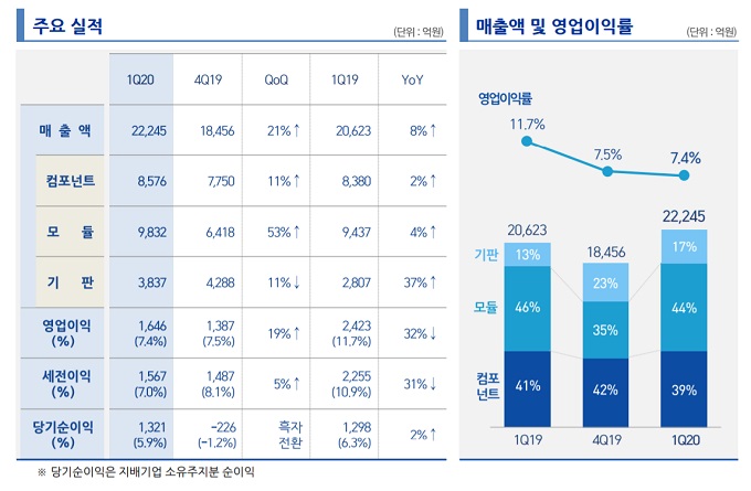 삼성전기는 전략거래선의 신규 플래그십 스마트폰에 고부가 카메라모듈 공급을 확대했고, PC 및 산업용 MLCC (Multi-Layer Ceramic Capacitor: 적층세라믹캐패시터) 판매가 늘어 전분기 대비 실적이 개선됐다고 설명했다. 전년 동기('19.1Q) 대비 매출은 8% 늘어났지만 MLCC ASP(평균판매가격) 하락으로 영업이익은 32% 감소했다.