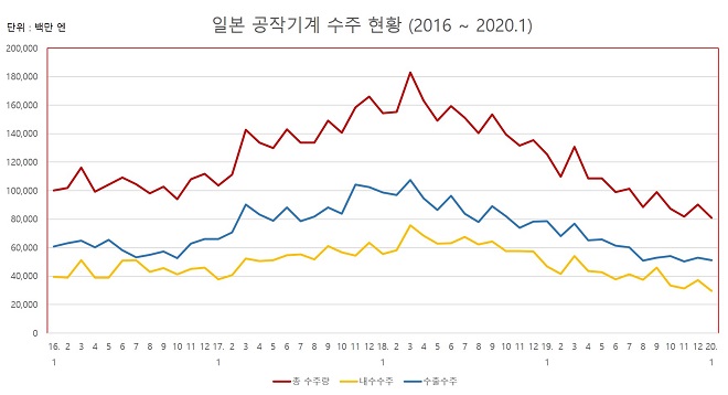 일본공작기계협회는 “미-중 무역 갈등은 여전히 자본투자에 영향을 미치고 있고, 이로 인해 내수수주, 수출수주 모두 약세에서 벗어나지 못하고 있다. 더욱이 코로나19는 제조업에도 영향을 미치고 있는 상황으로, 미-중 무역 갈등과 함께 면밀히 모니터링 해야 할 요인”이라고 지적했다.