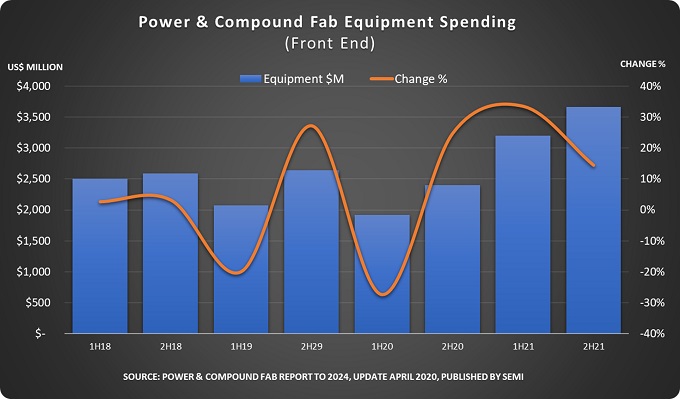 SEMI의 최신 전력 및 화합물 반도체 보고서에 따르면 전력 및 화합물 반도체에 대한 팹 장비 투자액은 2020년 하반기에 반등한 후 2021년에는 올해 대비 59% 성장한 69억 달러로 역대 최대 투자액을 기록할 것으로 보인다. 올해 투자액은 2019년 대비 약 8% 감소할 것으로 예상되고 있으나, 하반기에 코로나19가 회복세로 접어들면 감소치는 더욱 둔화될 것으로 보인다.