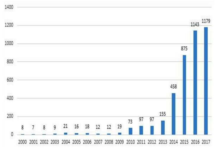 특허청에 따르면, IoT 서비스 관련 특허가 2012년 이전 까지 연간 100건 미만에 머물다가, 2017년에 1,179건으로 11배 이상 급증한 것으로 나타났다.
