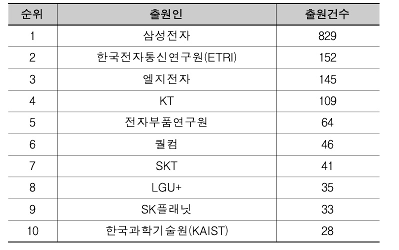출원인은 중소기업(1,857건, 33%), 대기업(1,351건, 24%), 개인(1,006건, 18%), 대학과 연구소(810건, 15%), 외국법인(468건, 8%) 순으로 출원 하고 있으며, 중소기업과 개인, 대학과 연구소가 상대적으로 높은 비중을 차지하고 있다.