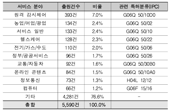 특허청은 주요 기술별로 구분해 보면, 원격 감시제어, 농어광업, 헬스케어, 전기·가스·수도, 공공서비스, 교통·자동차, 온라인 콘텐츠 제공, 통신 네트워크, 컴퓨터 장치 등 여러 분야에 응용되고 있는 것으로 파악된다고 전했다.