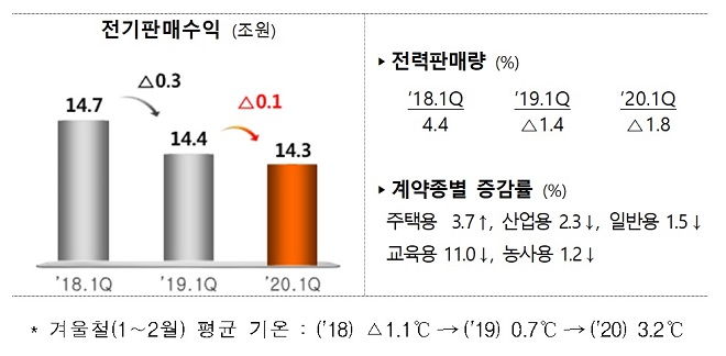 코로나19 여파에 따른 전력판매량 하락으로 전기판매수익(14조 3044억 원)은 전년 동기대비 1331억 원 줄었다.