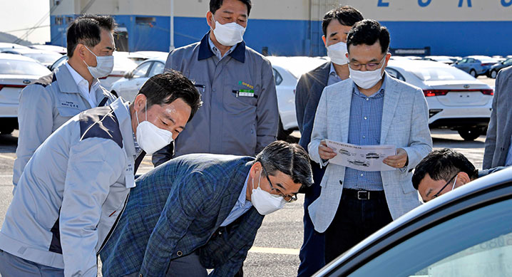 ▲ 기아자동차 송호성 사장(가운데)이 20일(수) 수출선적부두 평택항을 방문해 직원들에게 수출을 독려하고 차량 품질을 점검했다. 사진은 기아차 송호성 사장이 평택항에서 니로EV 품질점검하는 모습이다.