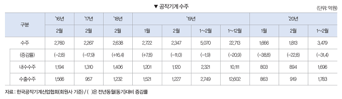2020년 1~2월 공작기계 수주는 3479억원으로 전년동기대비 31.4% 감소했다. 내수수주는 1696억원으로 전년동기대비 26.9% 감소했으며, 수출수주 또한 1783억원으로 전년동기대비 35.1% 감소했다.