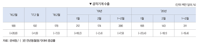 2020년 2월 공작기계 수출은 1억4300만 달러로 전월대비 15.3% 감소했다. 전년동월과 비교해서도 18.1% 감소했다.