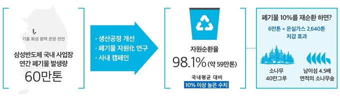 삼성전자 반도체 사업장의 자원 순환율은 국내 평균 대비 10% 이상 높은 수준이다. 이 10%에 해당하는 폐기물 약 6만톤을 온실가스로 환산하면 연간 CO2 2,640톤 수준이며, 이는 소나무 40만 그루를 심어야 흡수할 수 있는 양이다.