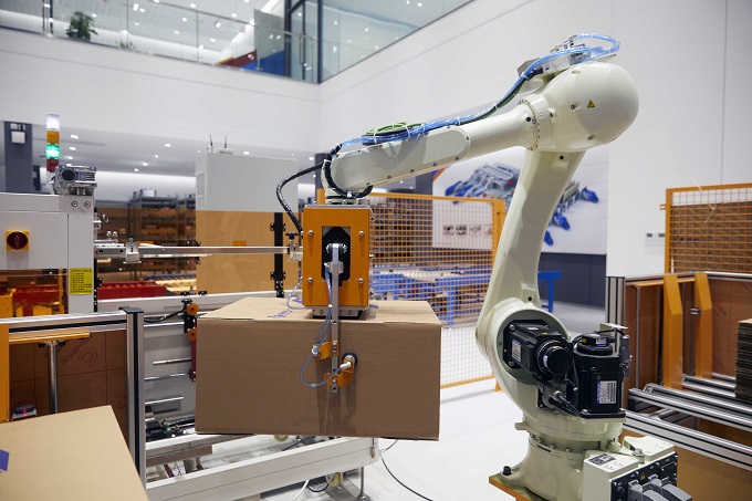 CJ대한통운 TES물류기술연구소에서 개발중인 로봇팔, CJ대한통운은 로봇을 이용한 팔레타이징 기술과 하차자동화 기술을 개발하는 국책과제에 사업자로 선정되었다.