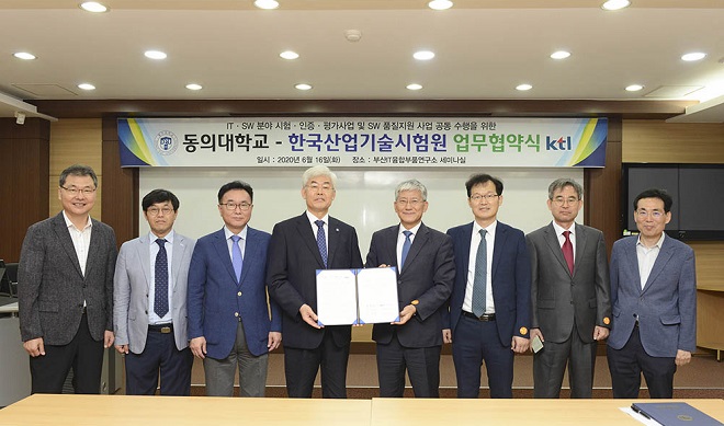 한국산업기술시험원(이하 KTL)이 6월 16일 동의대학교와 정보기술(IT)산업·지역 소프트웨어(SW) 산업 발전을 위한 업무협약을 체결하고, 동의대 부산IT융합부품연구소를 KTL마크인증 평가기관으로 지정하는 현판식을 개최했다고 밝혔다.