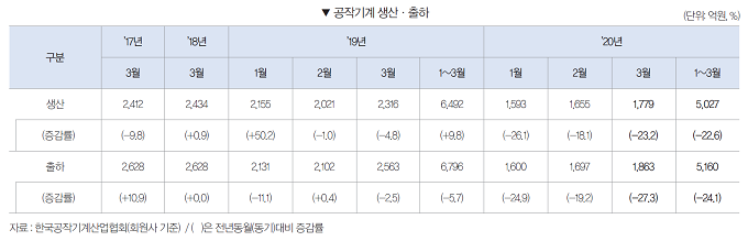 2020년 1 ~ 3월 공작기계 수주는 4965억원으로 전년동기대비 32.4% 감소했다. 내수수주는 2465억원으로 전년동기대비 24.2% 감소했으며, 수출수주 또한 2500억원으로 전년동기대비 38.9% 감소했다.