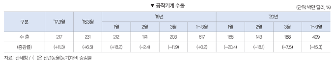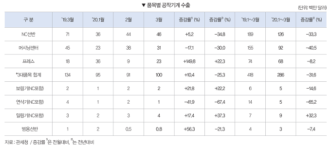 2020년 3월 공작기계 수출은 1억8800만 달러로 전월대비 32.0% 증가했다. 전년동월과 비교해서는 7.5% 감소했다. 2020년 1∼3월 공작기계 수출은 4억9900만 달러로 전년동기대비 15.3% 감소했다.
