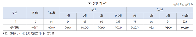 2020년 3월 공작기계 수입은 9100만 달러로 전월대비 45.3% 증가하였으며, 전년동월대비는 9.0% 감소했다. 2020년 1∼3월 공작기계 수입은 2억2500만 달러으로 전년동기대비 -12.9% 감소