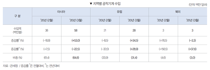 3월 공작기계 시장은 코로나19 확산에 따른 글로벌 경기둔화와 유가급락 등으로 수주는 감소하였으나 중국의 조업재개 및 공장가동 정상화에 힘입어 수출·입은 전월대비 큰 폭으로 증가하였다.