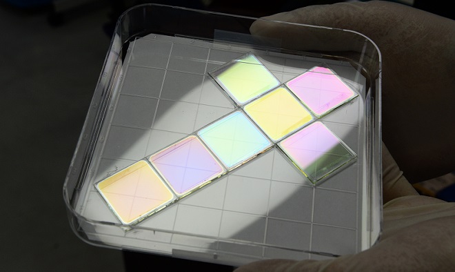 ▲ETRI 연구진이 개발한 친환경 컬러 CIGS 박막 태양전지 사진