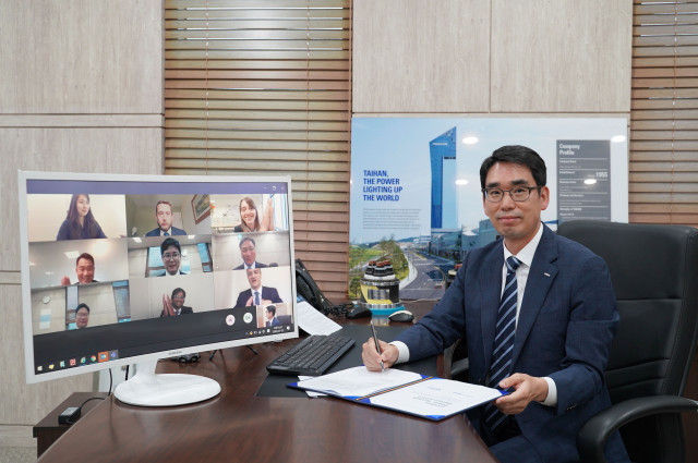 ▲ 대한전선과 내셔널그리드의 주요 임원이 참석한 가운데 LPT2 프로젝트 계약을 온라인 화상 서명식으로 체결하고 기념촬영을 하고 있다. (사진 : 대한전선)